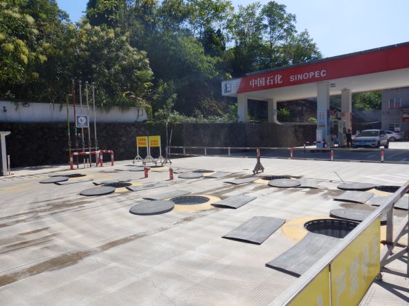 加油站設(shè)置汽油卸油和加油油氣回收系統(tǒng)。加油區(qū)設(shè)置加油罩棚,罩棚為混凝土框架結(jié)構(gòu)罩棚。罩棚下設(shè)置4臺(tái)雙油品雙槍自吸式加油機(jī)(汽油加油槍帶油氣回收);埋地油罐區(qū)設(shè)有4只30m³埋地臥式單層鋼制油罐(油罐均為車道罐,設(shè)置在承重防滲罐池內(nèi)),其中2只30m³汽油罐(分別儲(chǔ)存92#汽油和95#汽油),2只30m³柴油罐(儲(chǔ)存0#柴油),折合油罐總?cè)莘e為90m³(柴油罐容積折半計(jì)入),根據(jù)《汽車加油加氣加氫站技術(shù)標(biāo)準(zhǔn)》GB50156-2021的相關(guān)規(guī)定,該加油站為三級(jí)加油站。